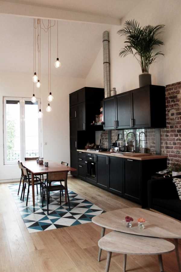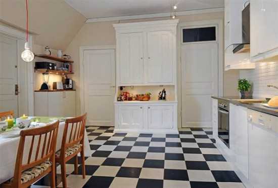 - чем светлее кухонный пол, тем больше кажется само помещение, и чем темнее покрытие — тем меньше, соответственно, кухня.