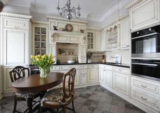Главные требования, предъявляемые к кухне в классическом стиле — это умеренность, спокойные тона, отсутствие излишеств и как можно больше натуральных материалов в интерьере. Для такой кухни прекрасно подойдет керамическая плитка бежевых и светло-коричневых оттенков — в случае, если кухня светлая.
