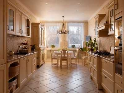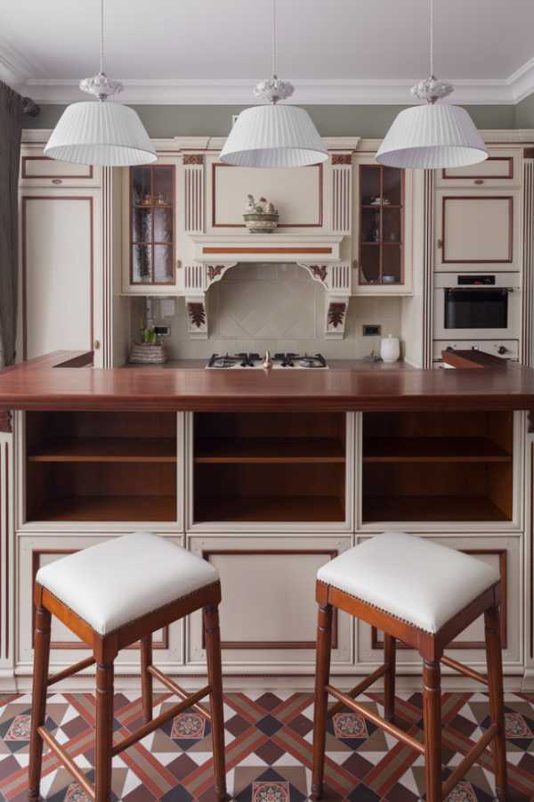 Плитка на кухне в классическом стиле обязательно должна сочетаться по цвету с мебельным гарнитуром — это придаст атмосфере солидности, строгости и вместе с тем уюта.