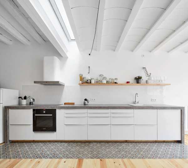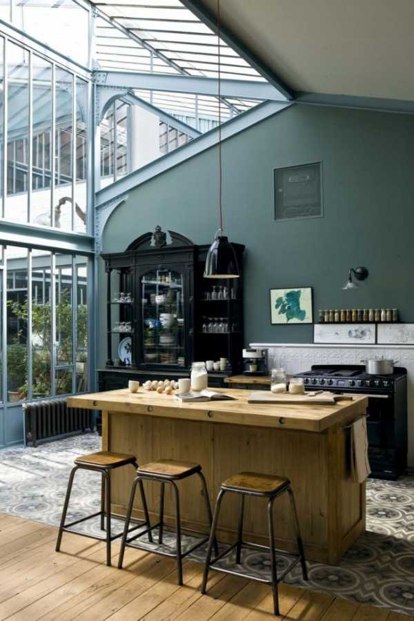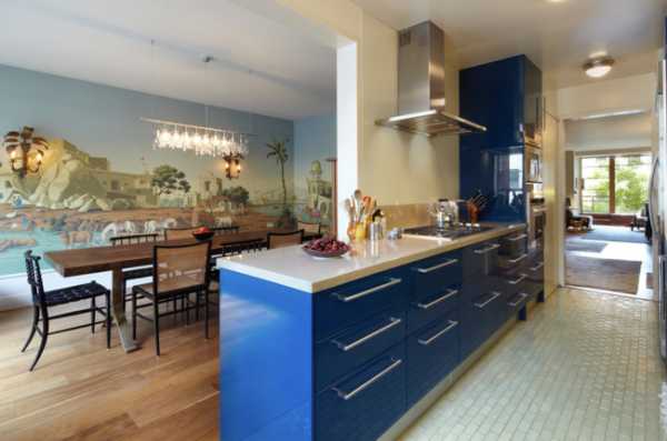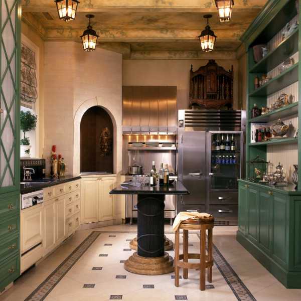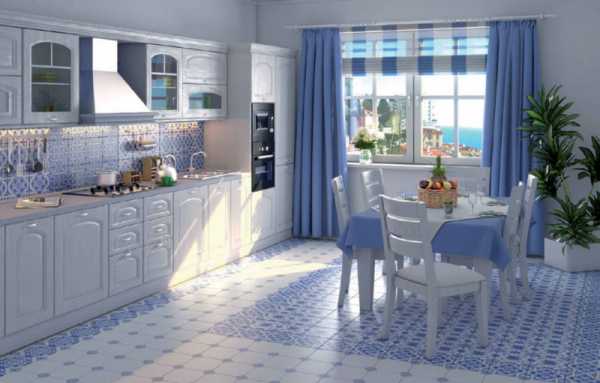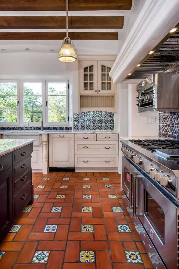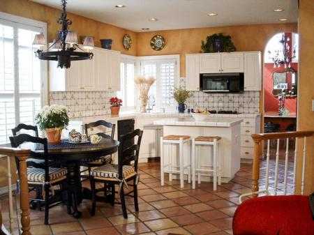 Средиземноморье ассоциируется с легкостью, обилием света, яркими красками и близостью моря. Именно эти ощущения и должен передавать интерьер кухни, выполненной в таком стиле. Как правило, в оформлении средиземноморской кухни активно используется светлая и белая мебель и бытовая техника. А вот пол и «фартук» на стенах делают достаточно яркими — к примеру, синего или зеленого цвета. С таким полом хорошо будут сочетаться живые или искусственные цветы, цветочный орнамент.