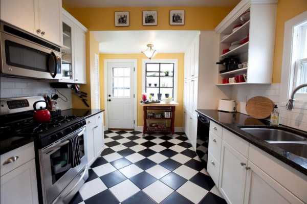 Укладывать напольный кафель для кухни можно совершенно разными способами. Самыми распространенными из них считается укладка параллельно стенам, по диагонали помещения, елочкой и различные смешанные варианты.