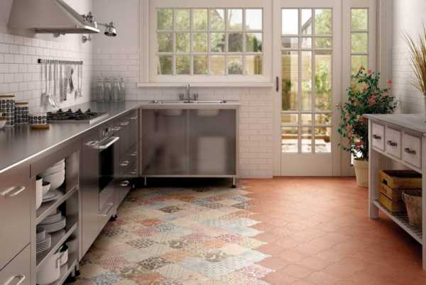 Для создания оригинальной поверхности подбирается самая разная половая плитка для кухни. Играя ее размером, формой, типом поверхности, можно добиться очень оригинальных и интересных решений в дизайне.