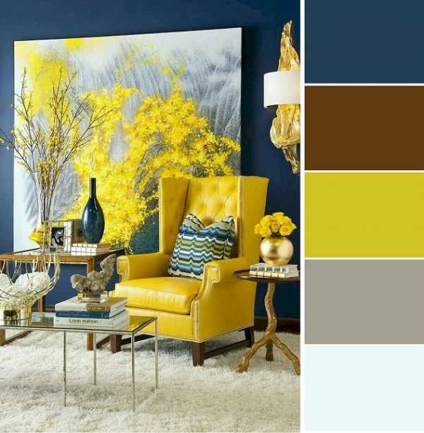 Это решение оформления интерьера составлено на контрасте. Основным, доминирующим цветом в проекте выступает глубокий темно-синий, а поддерживает его коричневый цвет, в котором выполнены некоторые мебельные аксессуары. В контраст с ними идет один из оттенков желтого — в данном случае приближенный к натуральному цвету мимозы. Этот цвет получается при добавлении к чистому желтому небольшого количества коричневого оттенка.