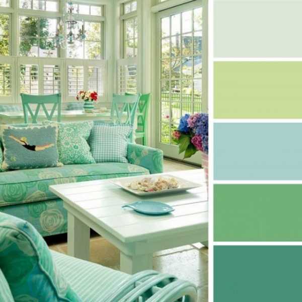 Это подборка летних легких цветов, хорошо подходящих для оформления веранд, а также комнат дачных домов. Основным в этой подборке цветовой гаммы является практически белый с легкой голубизной оттенок — в него окрашены рамы окон, которые в данном случае являются частью интерьерного дизайна. Это связано с тем, что для наличия большого количества естественного света в помещении отсутствуют портьеры. Подобный вариант хорош в том случае, если окна веранды находятся в тени крон деревьев, иначе она будет перегреваться в жаркий летний день.