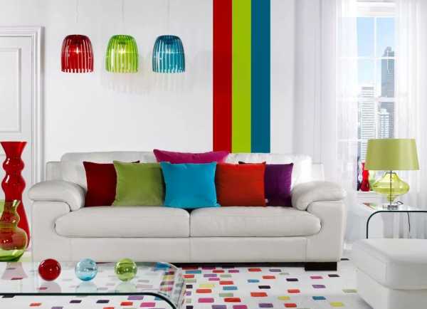 Использование трех основных цветов, которые всегда гармонично сочетаются между собой и могут использоваться в равных мерах. Сочетание красного, синего и желтого вызывает прилив эмоций и бодрость. Если они используются в чистом виде, то получается яркое и насыщенное решение. Если же использовать полутона, то оформление комнаты получается менее агрессивным и более комфортным.