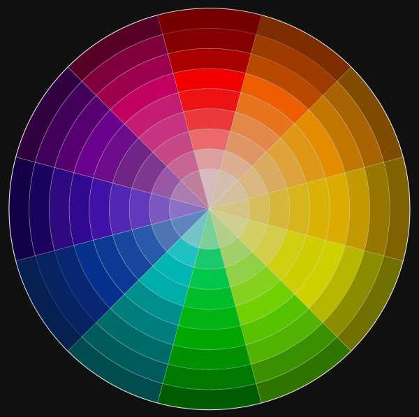 Цветовой кругВ секторах круга оттенки размещаются практически в таком порядке, как и в спектре видимого света, а для связки крайних тонов, дополнительно используется условный пурпурный оттенок