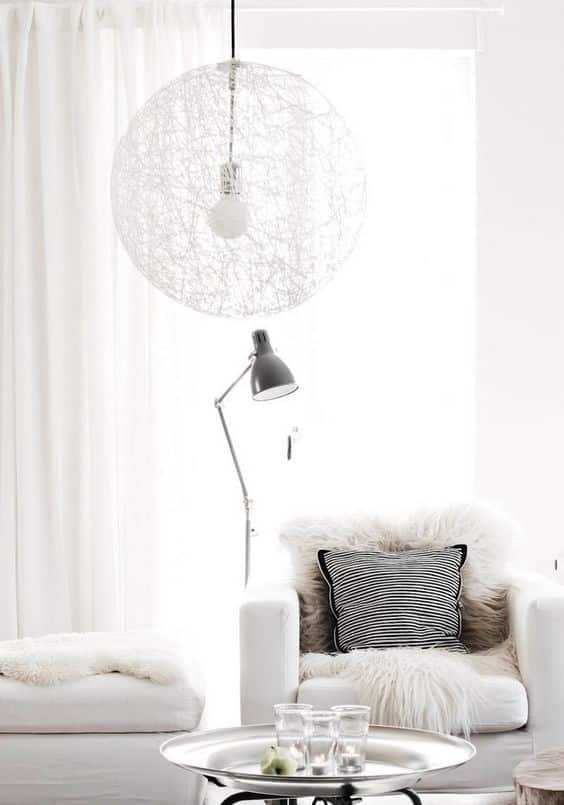Богатый серый цвет добавляет в интерьер глубины и уюта, в нем выполнен пуф-подставка для ног, установленный между диванами, имеющими белую обивку, добавляющую массивной мебели некоей «невесомости».