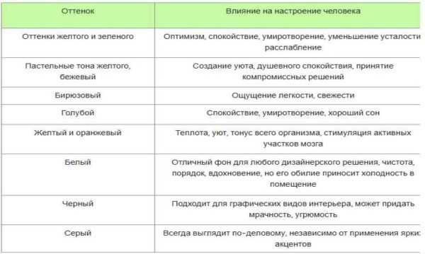 В этой таблице представлены самые популярные в оформлении интерьеров цвета и их оттенки и описаны эмоции, которые они способны вызвать.
