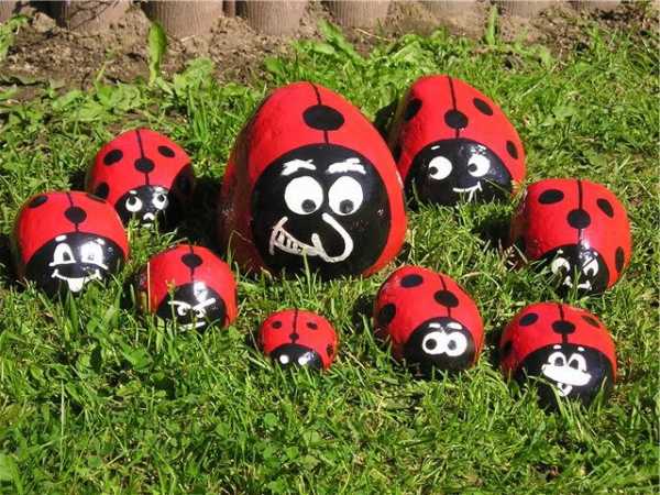 Чтобы рисунок не был размазанным, сначала окрасьте весь валун красной краской, а затем высушите. Далее нужно применять черный краситель, а после его высыхания следует расставить акценты белым и желтым.