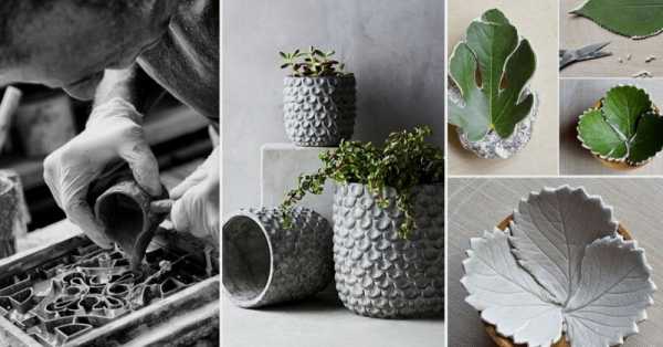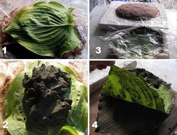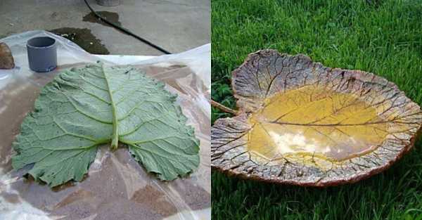 Покрыв большие зеленые листья растений раствором цемента и придав им необходимую форму, можно получить садовую вазу, ложе для фонтана, поилку для птиц и даже выложить получившимися листьями дорожку на дачном участке.