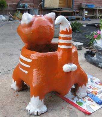 Красить такую фигурку можно водоэмульсионной краской, эмалью, автокрасками. После окраски покрываем поверхность лаком. На зиму садовую фигурку необходимо убрать с улицы, т.к. от морозов она может потрескаться. Возможно, и вы захотите завести себе такого замечательного кота.