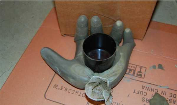 Нам нужна пластиковая емкость, пенопласт, армирующая сетка. Делаем раствор цемента, добавляя ложку гипса прямо в ладонь с раствором и так формируем нашу «скульптуру»