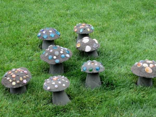 Тем, кто не имеет достаточного опыта работы с цементом в декоративных целях, рекомендуем начинать с чего-то простого, не требующего особых навыков. Это могут быть всевозможные шары, емкости для цветов, грибочки и прочее. Готовые изделия можно покрывать краской и украшать разными элементами декора.
