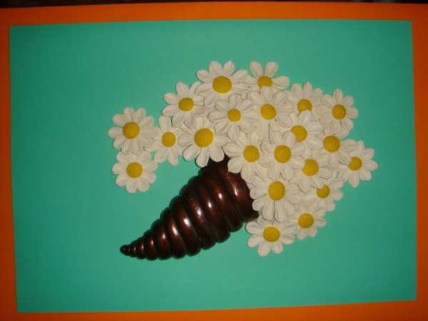 Теперь возьмите те части картона, которые вы отложили в самом начале, отрезав их от коробки. Соедините эти части скотчем и также при помощи скотча приладьте крышу из картона на кукольный домик. Теперь можно заселять в домик кукол, в домике можно прорезать окошко и вообще обустроить его по своему вкусу. Мы показали вам лишь как делается основа из картона для кукольного домика, а дальше вы сами можете фантазировать и при помощи коробок создавать домики для больших и маленьких куколок.Из бумаги также можно делать замечательные поделки, но мы остановимся на таком варианте как аппликация. В качестве примера возьмем подсолнух и попробуем вырезать его из бумаги и наклеить на картон, такой будет наша аппликация. Вам понадобиться: