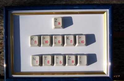 Оригинально поздравить с праздником поможет обычная старая компьютерная клавиатура. Буквы с неё нужно вынуть и приклеить на досточку любого цвета. Эту дощечку вставить в деревянную рамку и оригинальная поделка с инструкцией для любимой на 8 марта или День рождение готова.
