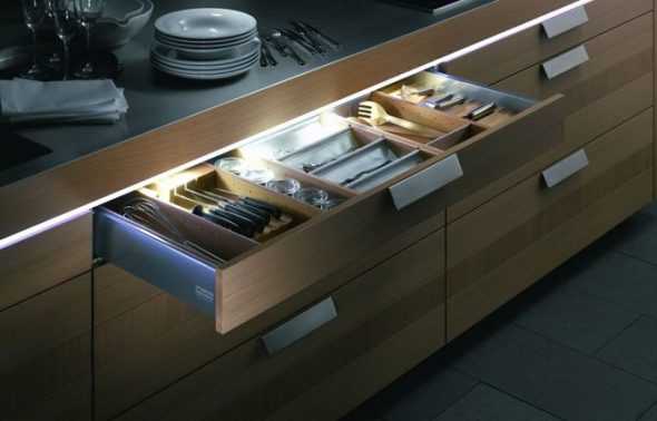 Подсветка выдвижного ящика с приборами на кухне