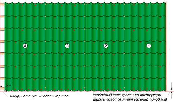 Все листы нужно укладывать параллельно карнизу, с обязательным 4-сантиметровым отвесом.