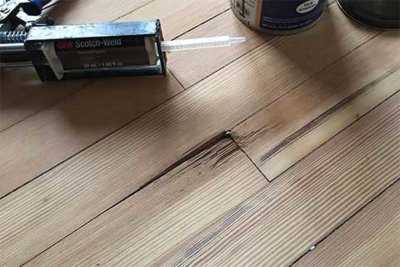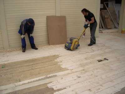 На следующем этапе работ осматривают деревянные пол на наличие повреждений, дефектные участки заменяют новыми. Далее необходимо удалить старую краску и выровнять поверхность при помощи цыклевания. При этом перепады высот не должны превышать 2 миллиметров. При наличии незначительных повреждений на досках проводятся следующие действия: