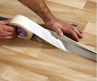Вторым вариантом монтажа покрытия считается предварительное приклеивание двустороннего скотча на деревянное основание. В данном случае у пользователя не возникнет проблем при возможной замене линолеума. Скотч наклеивают в виде сетки через каждые 50 сантиметров, после чего аккуратно разглаживают напольное покрытие.