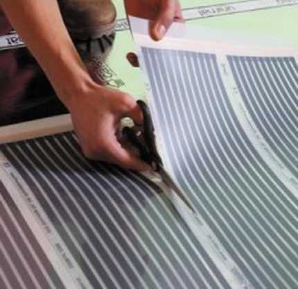 При нарезании инфракрасной пленки на полосы нужного размера следует выполнять разрезы строго по линиям между секциями, иначе нагреватели будут повреждены