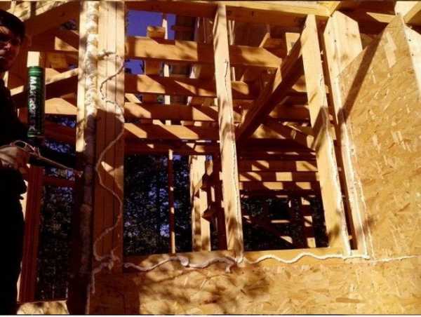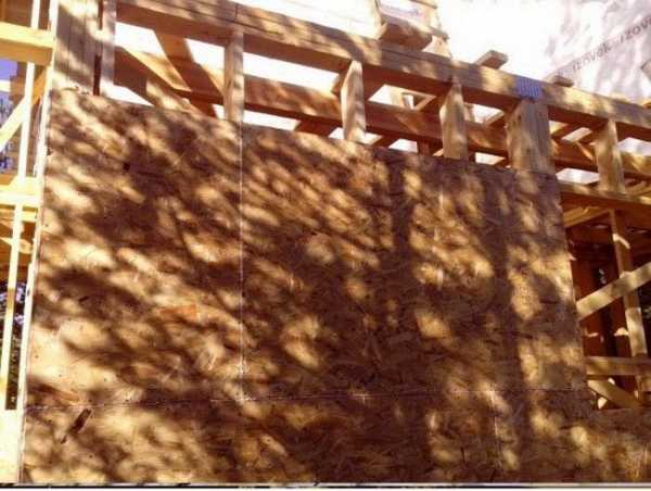 Далее, после покрытия крыши, автор приступает к обшивке стен. Это не дает ветру задувать в помещение, препятствовать дальнейшим работам и придает строению конструктивную жесткость. Для обшивки была выбрана OSB-3 9 мм толщиной.