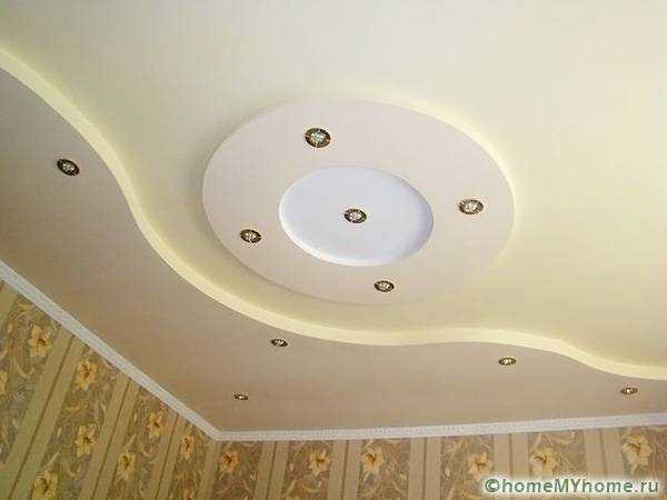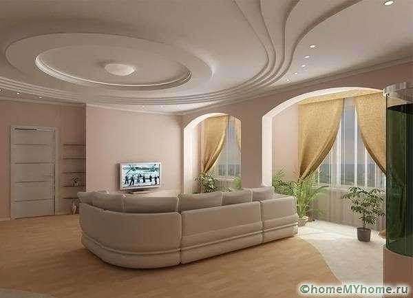 Двухуровневый гипсокартоновый потолок с дугообразным контуром.