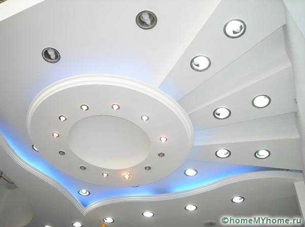 Установка осветительных приборов выполняется только после отделки, когда двухуровневые потолки из гипсокартона, фото которых вы уже видели, будут полностью завершены.