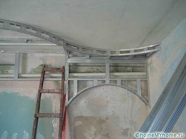 Каркас монтируется из оцинкованного холодногнутого металлического профиля не тоньше 0,5-0,8 мм. Именно точность и правильность монтажа каркаса определяет прочность и ровность всей конструкции, поэтому очень важно в самом начале грамотно и точно провести разметку. Все этапы сборки каркаса следует обязательно проверять строительным уровнем. Для закрепления профиля применяются особенные саморезы по металлу. Готовый каркас тщательно выверяют по уровню в нескольких направлениях, прежде чем приступить к облицовке гипсокартоном.