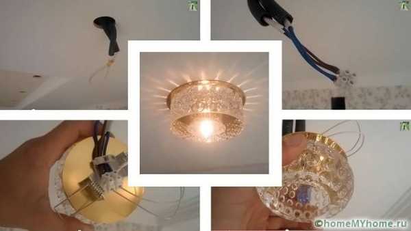 Люстра устанавливается в потолок самым обычным способом. Со светильниками же предстоит более тяжелая работа: необходимо в местах вставки освещения выполнить отверстия по размеру устройства, провести проводку, и только потом вкрутить сами светильники.