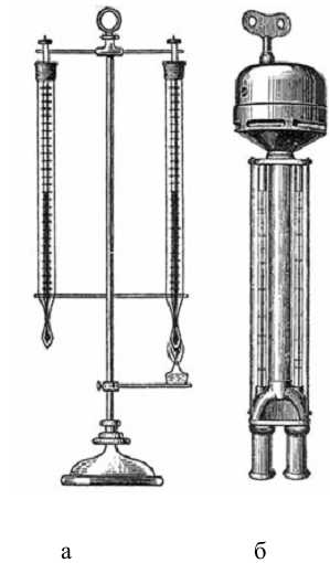 Станционный психрометр Августа (рис. 1а) состоит из двух одинаковых спиртовых термометров, резервуар одного из которых обернут кусочком тонкой гигроскопичной ткани, опущенной одним концом в стаканчик с дистиллированной водой комнатной температуры. Вследствие испарения воды температура влажного термометра будет ниже температуры второго (сухого) термометра. Показания термометров снимают через 15 минут после увлажнения одного из них.