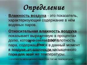 Влажность воздуха представляет собой один из самых важных параметров, которыми характеризуется состояние атмосферы. Она оказывает влияние на среду обитания человека, ее комфортность, и, соответственно, по этой причине контролируется экологическими службами. От уровня влажности, помимо непосредственно здоровья людей, зависит работоспособность многих предприятий, качество технических процессов, обстановка на выставках и в музеях. Непосредственно уровнем влажности воздуха определяется качество выполнения многих технологических процессов. Данная работа является актуальной, так как в современном мире вся жизнь и деятельность человека не являются возможными в отсутствие достоверных данных о характеристиках влажности. В данной работе будет рассмотрено понятие влажности, абсолютной и относительной, также внимание будет уделено способам измерения уровня влажности воздуха.