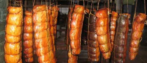 Далее набивают приготовленное мясо в хорошо промытые кишки и все туго перевязывают. Перед копчением колбаски оставляют в холодном помещении (+5 °С) на неделю. Далее колбасу коптят при температуре 20 °С 2-3 суток. На заключительном этапе колбаски выдерживают в сухом прохладном месте (+10 °С) 4-6 недель.