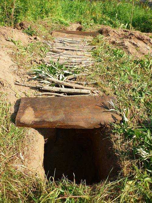 3. КамераДля коптилен, которые устанавливаются на открытом воздухе, дымоход устраивается в виде траншеи. Она выкапывается глубиной и шириной на штык лопаты. Сверху эту канаву прикрывают шифером или листом железа, закладывают дерном, чтобы дым не уходил понапрасну.