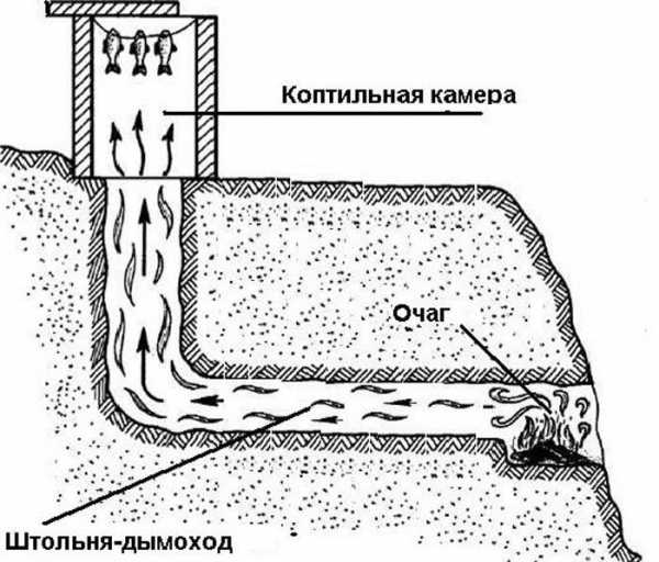 Обустроить такое приспособление на огороде или в саду будет не особенно сложно. Самое главное, чего нужно добиться при изготовлении такой коптильни, — это того, чтобы дым, прежде чего достигнуть рыбы или мяса, охлаждался. Сделать это можно, к примеру, путем обустройства между костром и камерой рва длиной около 3 м.