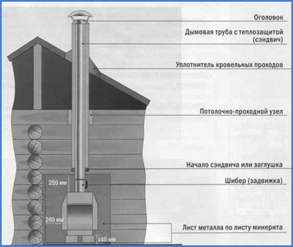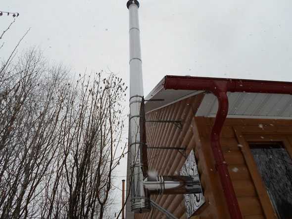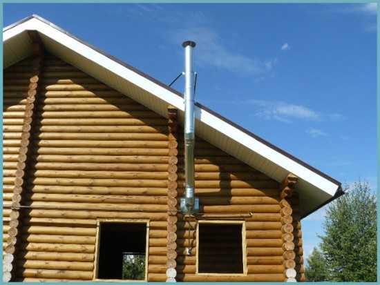 Для улучшения тяги дымовая труба возвышается над уровнем конька крыши.