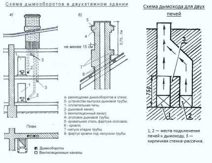 При объединении нескольких теплогенерирующих установок, для каждого из них создается свой дымоход. В исключительных случаях допускается врезка к общему дымоотводному колодцу, но при этом должна соблюдаться разница в высоте не менее одного метра.