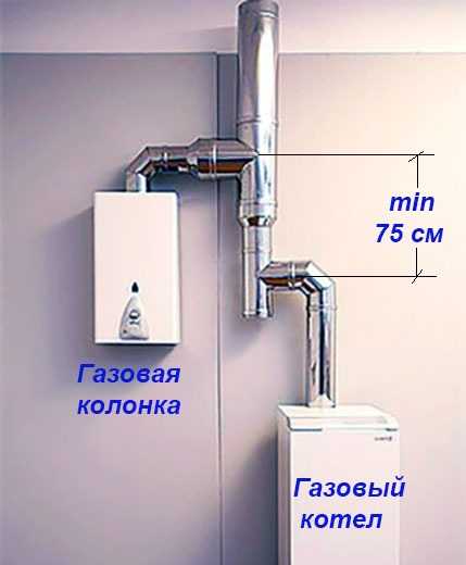 При расчетах площади сечения трубы дымохода во внимание берутся габариты патрубка, который установлен на конкретном газовом котле — дымоход в конечном итоге должен быть по размерам не меньше. К дымоотводной трубе могут присоединяться два котла, но только при условии, что их вводы будут располагаться разноуровнево и на расстоянии от 0,5 м относительно друг друга.