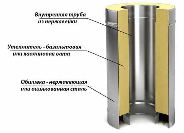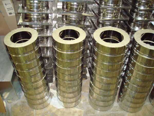 Изделие состоит из двух труб разного размера, при этом одна вставлена в другую. В качестве наполнителя между ними обычно применяется базальтовая вата.