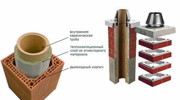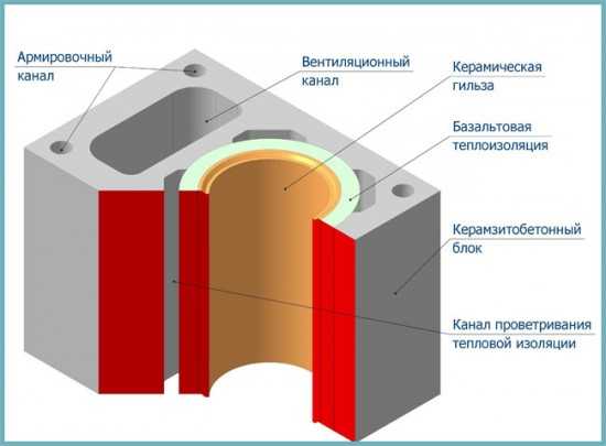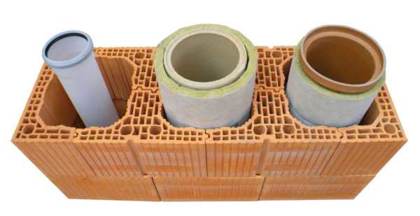 Несколько меньшим спросом у потребителей пользуется керамика, которая способна выдерживать до 1200 градусов. Конструкция также состоит из трех слоев: керамической составляющей, слоя утеплителя и твердой оболочки из керамзитобетона. Отличается дымоходы из данного материала простотой и надежностью, легкостью монтажа, а также высокой пожаробезопасностью.