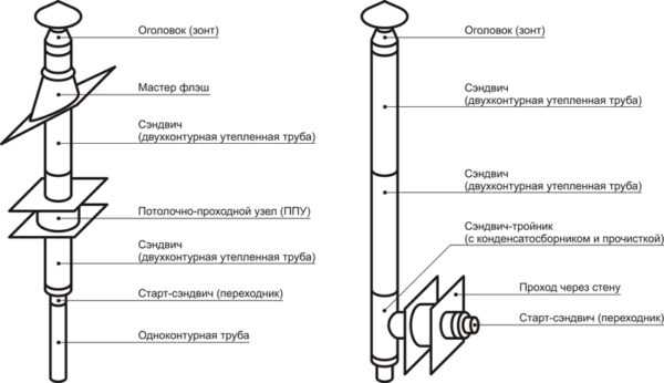 Дымоходы для газовых котлов монтируются снаружи (приставная система) и внутри здания. Наиболее простой является монтаж наружной трубы.