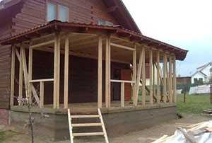 Порядок постройки открытой веранды или крыльца зависит от проекта и дизайна сооружения. Но в любом случае монтаж начинается с установки вертикальных стоек и связки их между собой горизонтальными перемычками. Здесь чаще всего используется деревянный брус 10 х 15 см или стальные профильные трубы сечением 80 х 60 мм, либо 60 х 60 мм.