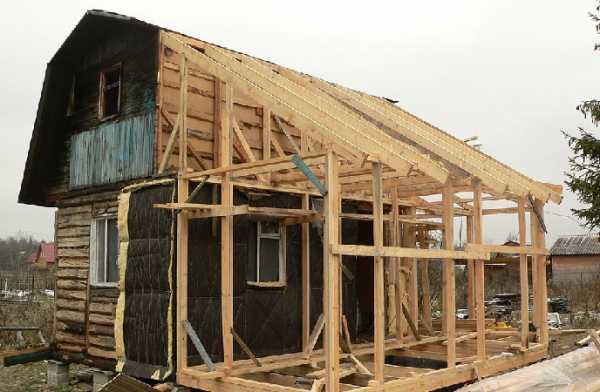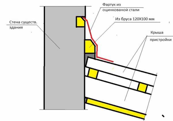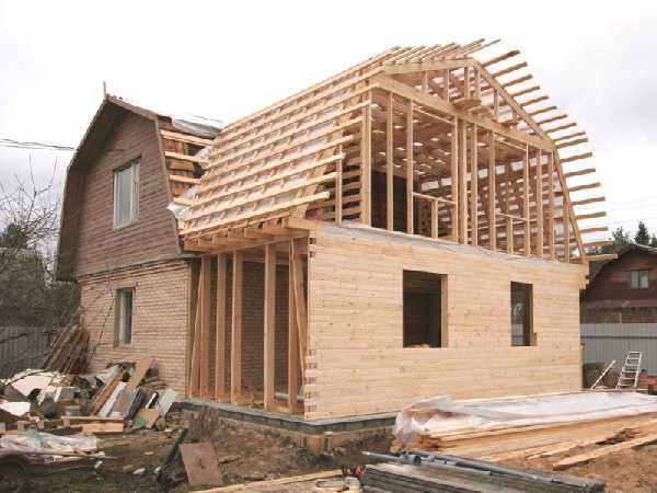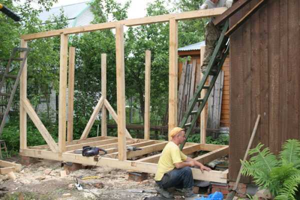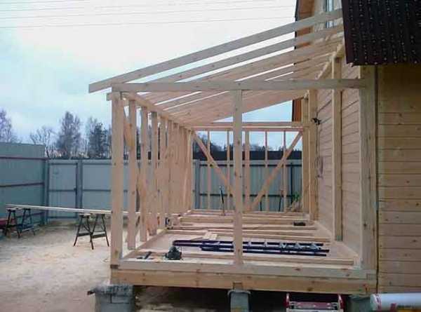 Как правило, крыша пристройки делается на деревянных балках, опираемых на существующую стену дома и новую перегородку. Алгоритм действий такой: