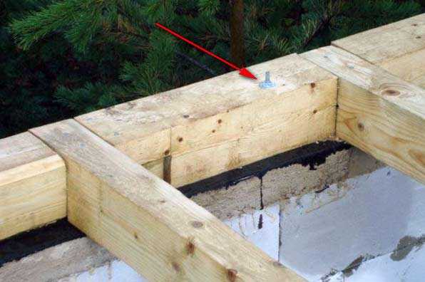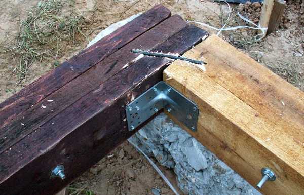 - Уложите на кирпичные столбики деревянные перемычки – брусья с минимальным сечением 10 х 15 см и закрепите их анкерами. На угловых опорах стыкуйте их вполдерева (как это сделать, показано на фото). Между собой бруски крепите стальными уголками на саморезах.