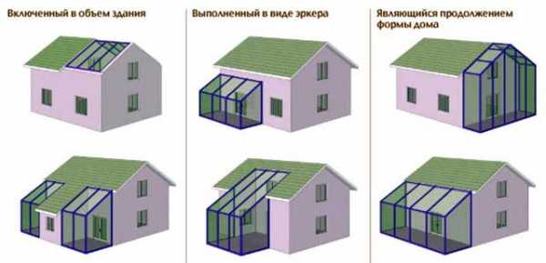 - Легкие пристройки – веранда, открытая терраса, тамбур или крыльцо с навесом из поликарбоната. Подобные помещения лучше строить на каркасе из дерева либо металлоконструкций, обшиваемом плитами ОСБ с последующей отделкой. Теплица и зимний сад делаются стеклянными.
