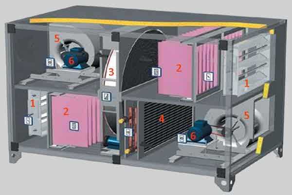Структурная схема: 1 — воздушные клапаны; 2 — карманные фильтры; 3 — рекуператор роторный; 4 — радиатор водяной; 5 — вентилятор; 6 — электродвигательКонструкция ПВУ (приточно-вытяжной установки) вентиляции включает широкий набор функциональных блоков, призванных обеспечить эффективность циркуляции воздушной среды: