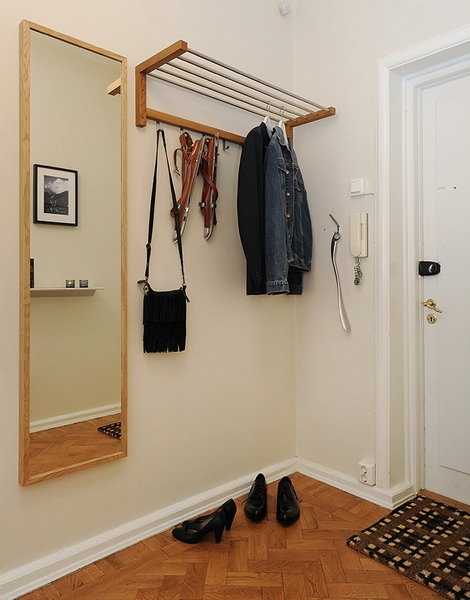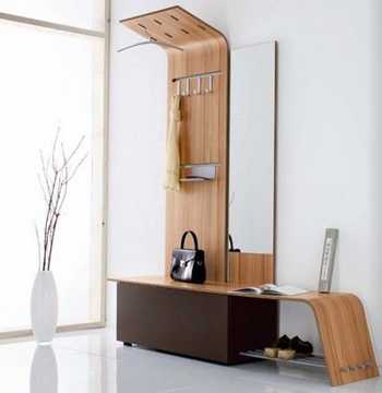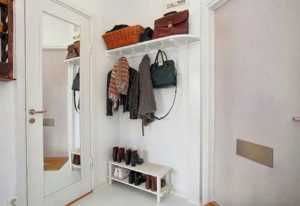 - непосредственно возле входной двери. Рекомендуется оставить немного места для крепления открытой вешалки, предназначенной для хранения верхней одежды. Такое решение считается оптимальным, если комната обладает квадратной формой. Если имеется прямоугольная узкая маленькая прихожая, то для нее придется выбрать малогабаритные и узкие предметы обстановки, а иначе вовсе может не остаться места для свободного передвижения по комнате;