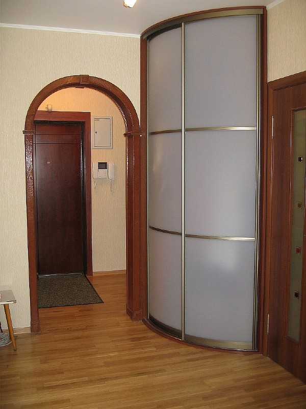 - радиусные — оригинальная корпусная мебель устанавливается в свободном углу, имеет красивую форму полукруга. Интересная модель является отличным дизайнерским решением для небольших прихожих, не имеет острых углов, обеспечивают максимально безопасное передвижение жильцов по стесненному в размерах помещению.