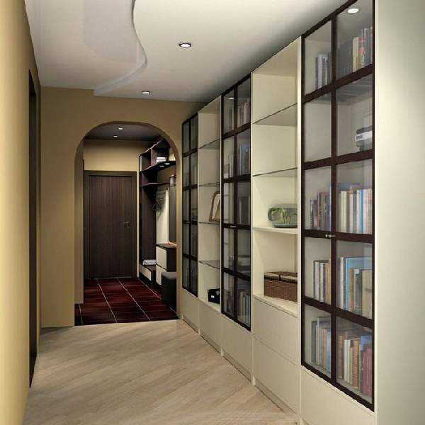 В интерьере длинной прихожей вполне можно разместить домашнюю библиотеку, рационально используя пространство. Ее не размещают у входной двери — здесь место мебели для одежды. Библиотеку оформляют в последующих зонах коридора с неглубокими полками. Собрания книг всегда считались гордостью хозяев, говоря об их интеллектуальном развитии. Поэтому, чаще всего, книжный шкаф в коридоре имеет открытые фасады, где литературные издания должны иметь аккуратный упорядоченный вид.