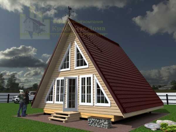 Интересный проект дачного домика примечателен интересно треугольной крышей и отсутствием крыльца, благодаря чему на строительство затрачивается меньше строительных материалов и времени.