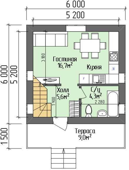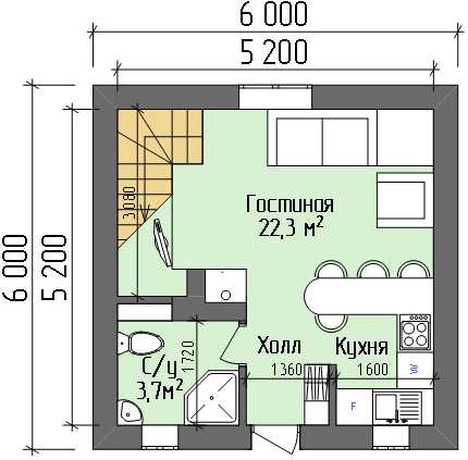 Проект дома 6×6 с мансардой получится интересней, чем для одноэтажного варианта. Внизу будет кухня 3х3 м и просторная гостиная 6х3 м. Перед входом войдет открытая терраса 4,5 кв. м и такой же площади прихожая.